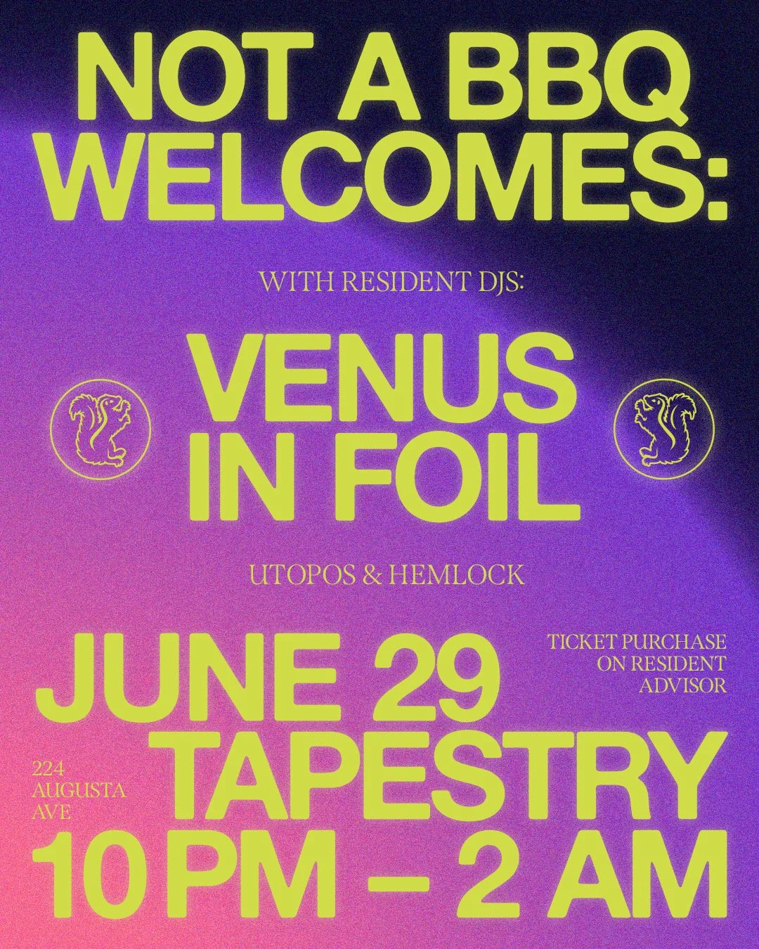 Last summer a friend of mine started hosting BBQs in his backyard. These BBQs started including electronic music and friends DJing until the early hours of the morning. The joke was that my friend started telling people there would be NO FOOD in the following gatherings, and so these gatherings were then called NOT A BBQ – @notabbq was born. My friend then created the first invite poster for NOT A BBQ featuring a skunk. He then requested me to do the following posters since then and adopted the skunk as our mascot.
